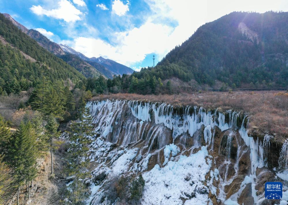 ??這是1月4日在四川省九寨溝風景名勝區拍攝的諾日朗瀑布形成的冰瀑景觀(無人機照片)。新華社記者 王曦 攝