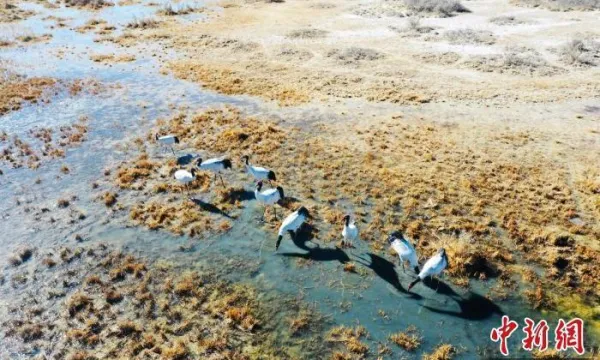 數(shù)十只黑頸鶴“如約而至”柴達木盆地都蘭湖濕地