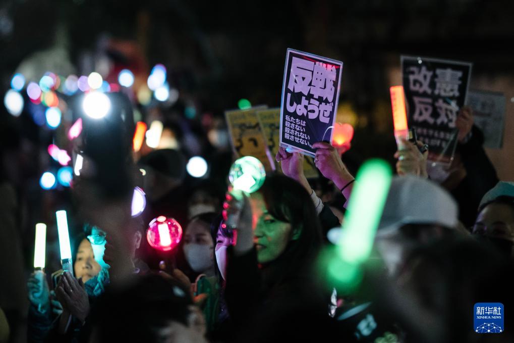 當晚的集會有近千人參加。抗議者手舉寫有“反對戰爭,維護憲法”“不要戰爭 不要高市”“不能容忍高市政治”等字樣的牌子,高呼“反對修憲”“守護和平”等口號,對高市企圖修憲表達不滿。