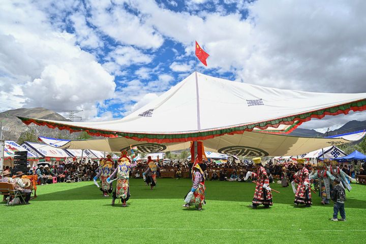 民間藏戲表演隊在西藏南木林縣非遺公園內表演湘巴藏戲(2025年7月16日攝)。新華社記者 李鑫 攝