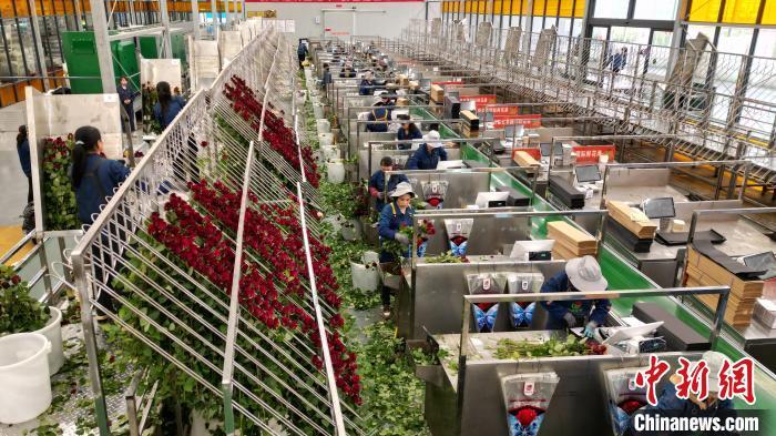 目前,當地建成面積20萬平方米高新智能化溫室,鮮花四季盛開。記者看到,棚頂紅色的全自動補光燈正在為玫瑰“延長光照時長”。精準控制營養液成分和濃度的智能化水肥一體化系統、自動化分選等高新設備投入,科技種植和品質上升,讓臨夏成為中國重要的優質鮮切花生產基地,日產20萬枝鮮切花,海內外訂單不斷。