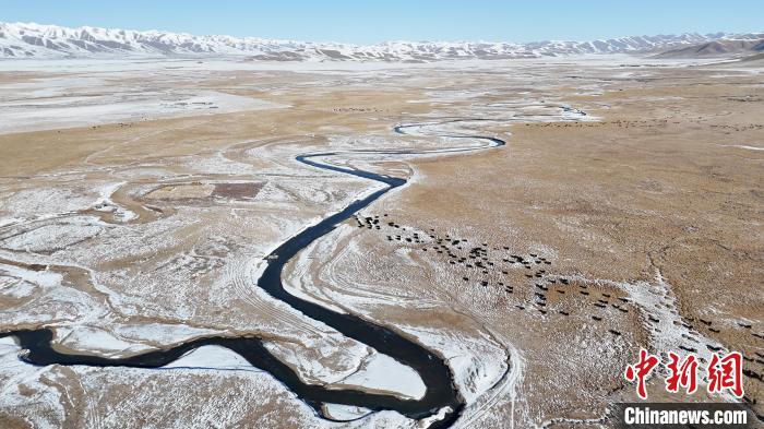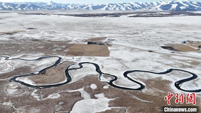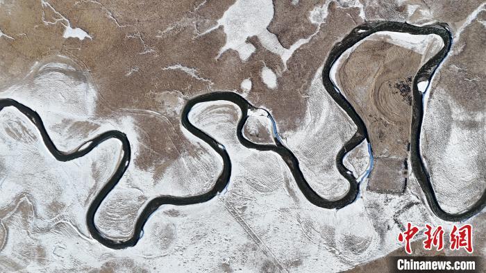 圖為雪后的瑪曲縣阿萬倉濕地,河流逶迤蜿蜒似長龍。(無人機照片)中新社記者 九美旦增 攝