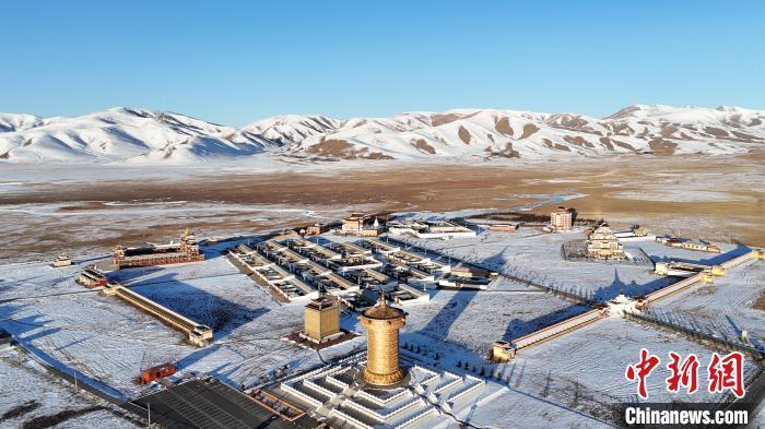 圖為阿萬倉鎮寧瑪寺大經筒與周圍的白雪形成了鮮明的對比。(無人機照片)中新社記者 九美旦增 攝