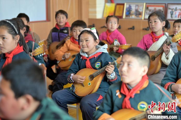 中新社記者近日探訪瑪曲縣寄宿制藏族小學(xué)彈唱社團活動,未進教室,已聽到室內(nèi)傳出的歡快琴聲和笑聲。
