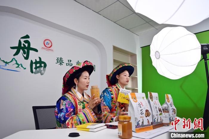 圖為舟曲縣電子商務(wù)直播中心工作人員直播銷售當?shù)胤洚a(chǎn)品。中新社記者 九美旦增 攝