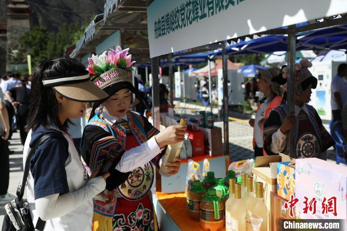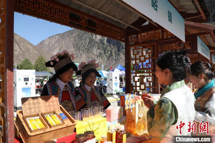 圖為工作人員向嘉賓介紹當?shù)貎?yōu)質(zhì)蜂產(chǎn)品。中新社記者 九美旦增 攝