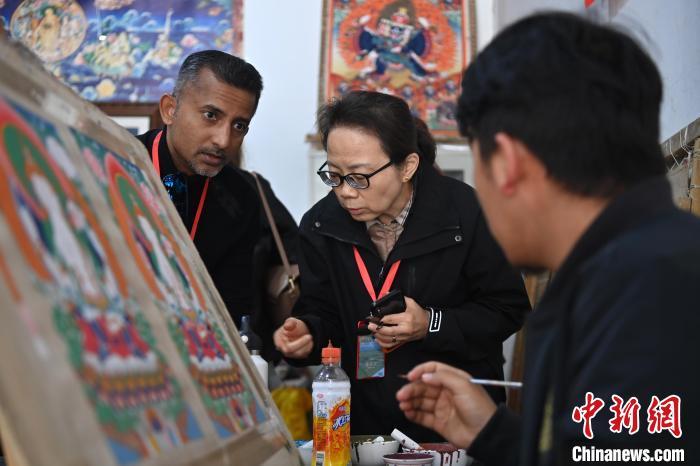 6月10日,甘肅甘南藏族自治州夏河縣,中外嘉賓在唐卡小鎮(zhèn)采訪唐卡畫師。中新社記者 九美旦增 攝