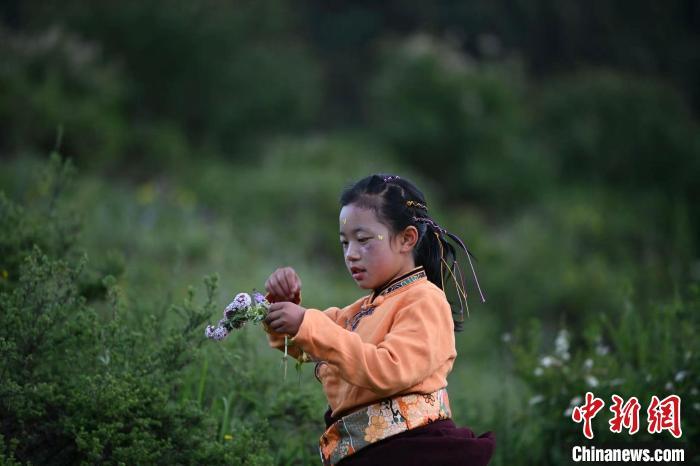 圖為則岔村中的藏族小女孩在則岔石林景區(qū)內(nèi)采花編花環(huán)。九美旦增 攝