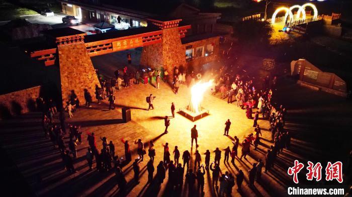 圖為海外華媒代表與當?shù)孛癖妵艋鸸蔡伹f舞,體驗藏族文化的獨特魅力和民族風情。九美旦增 攝