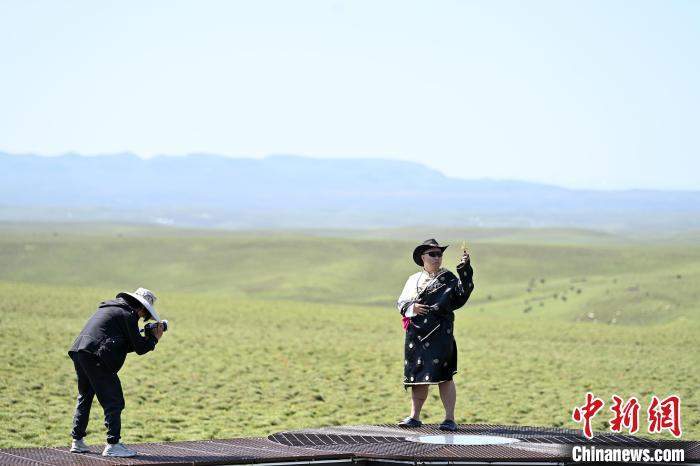 圖為在美仁大草原觀景臺上,游客體驗藏裝拍攝。九美旦增 攝