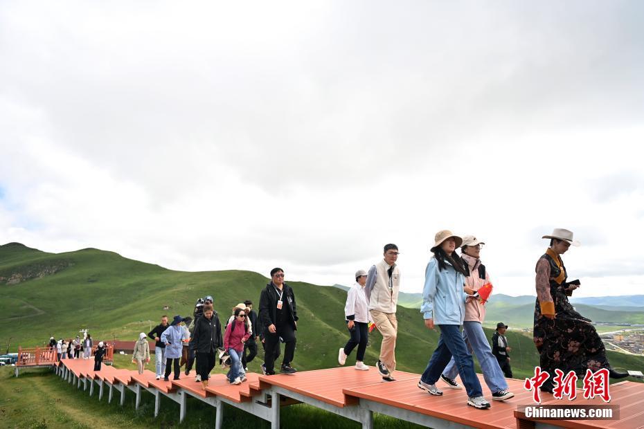 7月12日,游客在瑪曲縣阿萬倉濕地游覽。中新社記者 九美旦增 攝