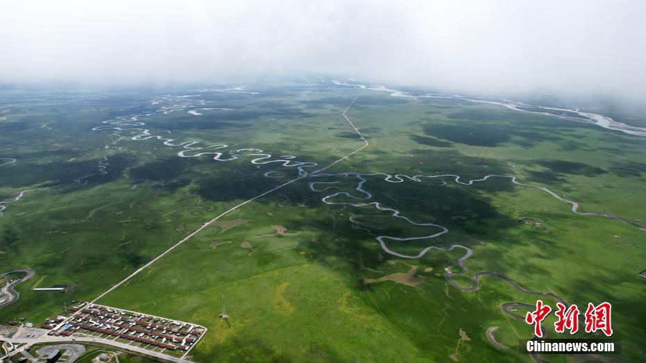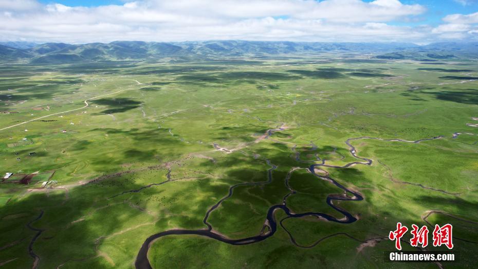 7月12日,瑪曲縣阿萬倉濕地風景如畫。(無人機照片)中新社記者 九美旦增 攝