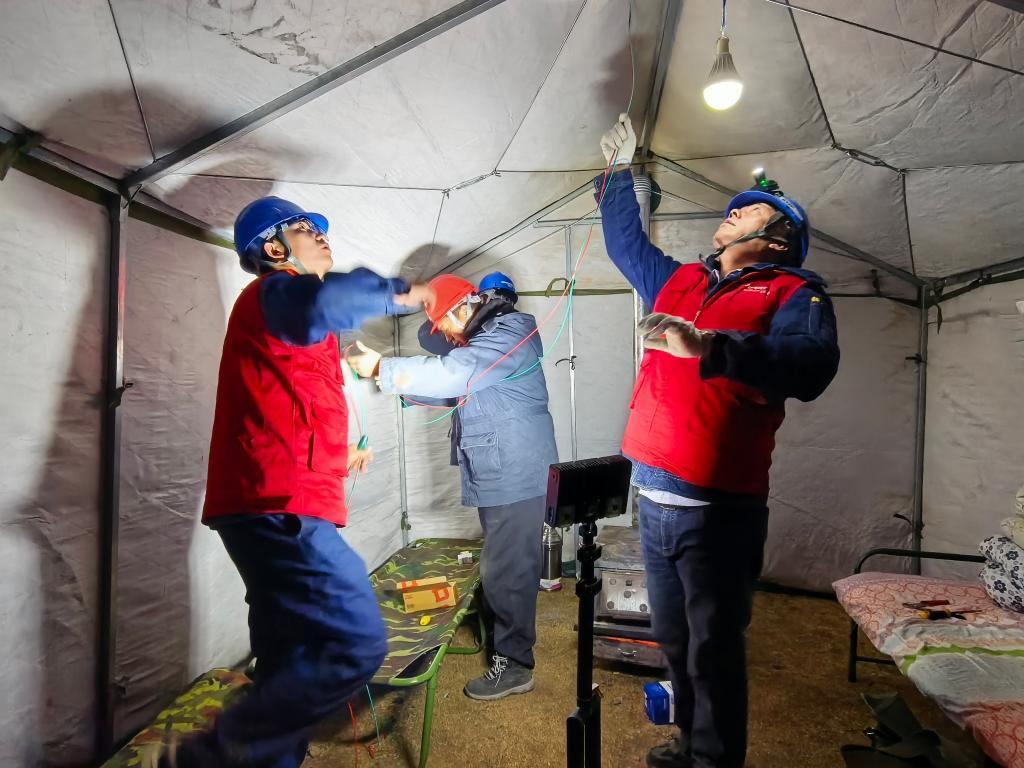 1月26日晚,國網甘南供電公司工作人員為臨時安置點應急帳篷接電。國網甘南供電公司供圖