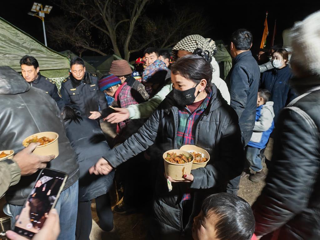 1月26日晚,在甘南州迭部縣電尕鎮哇曲村臨時安置點,群眾正在領取愛心餐食。新華社記者 崔翰超 攝