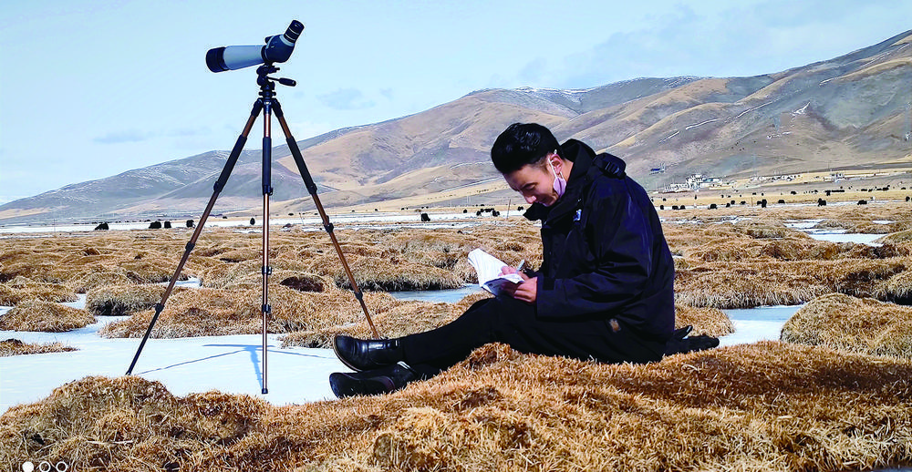 生態管護員昂文才仁開展鳥類監測。