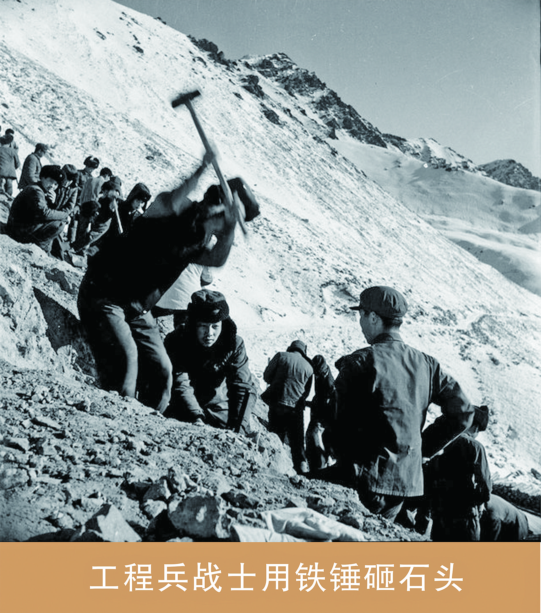 據參與修筑同寶山公路任務的10連副指導員宋同太回憶,當時,施工條件簡陋,沒有大型機械,筑路工程全靠人工,施工地段都是硬石山地,施工難度大。10月的同寶山上氣溫下降到攝氏零下30多度,全部是冰凍層,山路難行,短短20公里路,汽車要行駛1個多小時才能到半山腰。車上不去,戰士們就背著100多斤的帳篷一步步往上爬,半夜12點才到達山頂。隨后又連夜搭帳篷,直到凌晨2點多鐘才得以休息。在兩個多月的同寶山公路建設中,天寒地凍、常年冰雪,地面用鐵鍬挖不了,用石鎬刨不動,一鎬下去,也只刨出一個小坑。常常,戰士們的手被震麻動彈不得,有的人手起了泡、磨出了血,但仍然用鋼釬鉆、大錘砸,打眼放炮。戰士們在山上喝冰雪融化的水,吃夾生米飯、饅頭,肚子發脹難受,炊事班長就以烙大餅來解決吃夾生飯的問題。