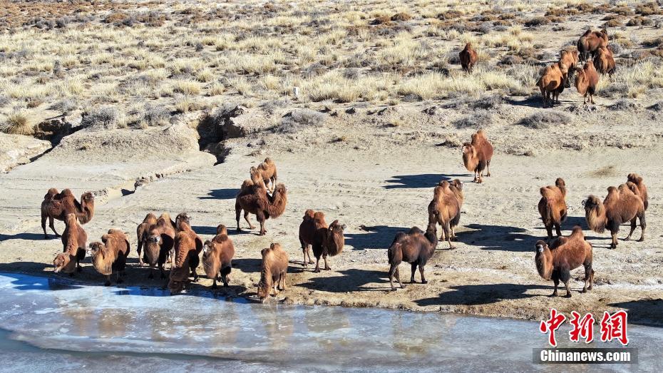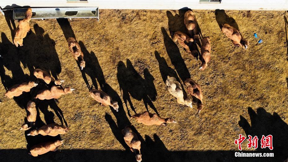 12月6日,在位于青海省海西蒙古族藏族自治州烏蘭縣茶卡鎮(zhèn)以南約18公里處的莫河駝場,駱駝在休息覓食。(無人機照片)