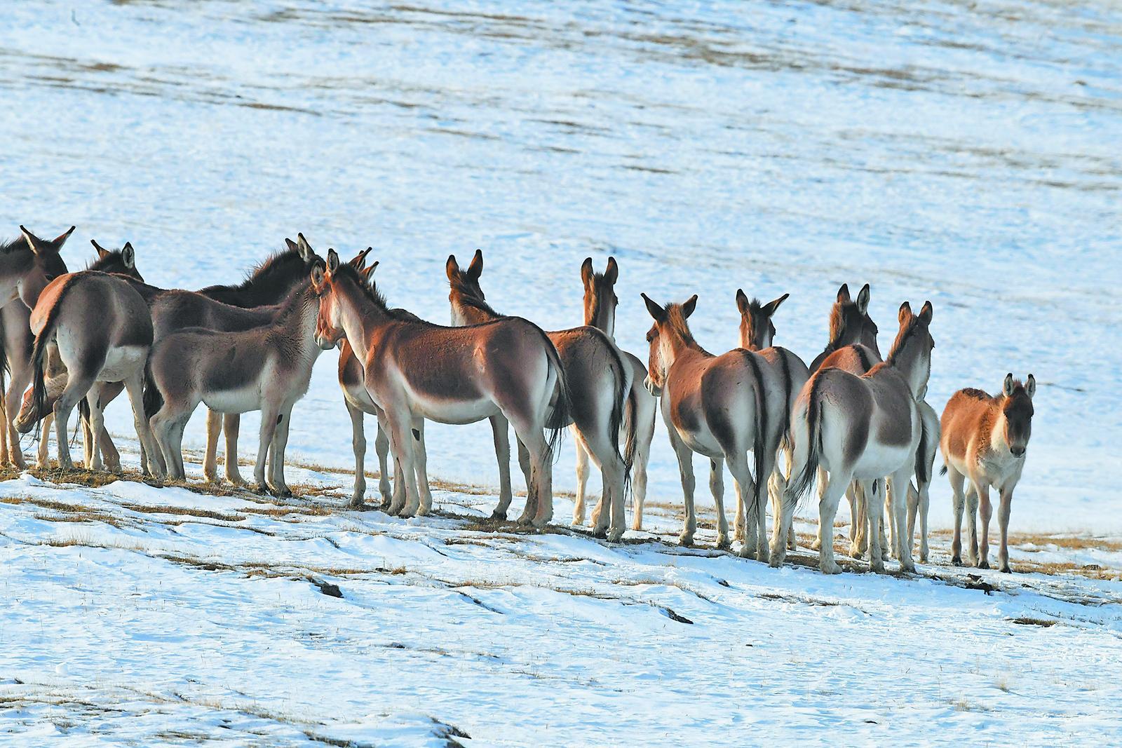 雪原上漫步的藏野驢。