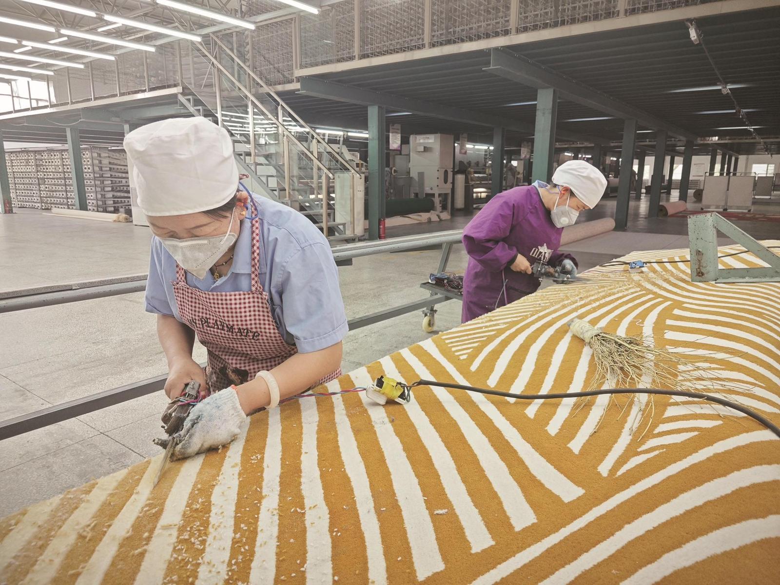 技術的革新還體現在新型阿克明斯特機織與手工槍刺結合的生產線——80%機織打底、20%手工精修,價格比純手工低,還保留80%的工藝質感。2024年,3萬平方米的年產量中,有1.2萬平方米用于國外高端酒店。