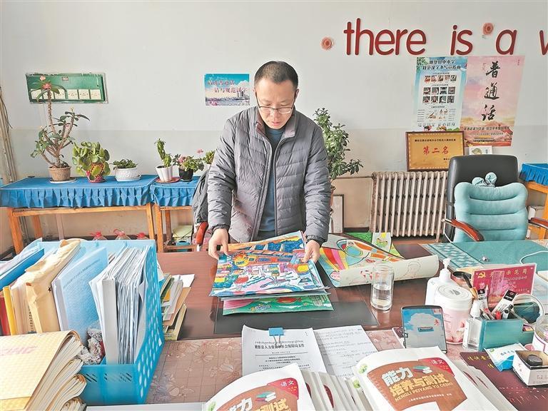 陳磊查看學生的繪畫作品。通訊員 王曉炯 攝