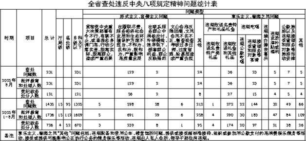 為持續加固中央八項規定堤壩,以嚴的基調、嚴的措施、嚴的氛圍深入推進作風建設常態化長效化,現將2025年8月全省查處違反中央八項規定精神問題有關情況通報如下: