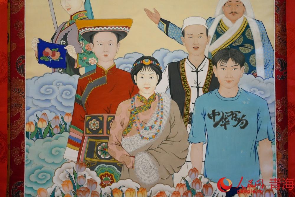 以民族團結為主題的唐卡作品。人民網記者 況玉攝