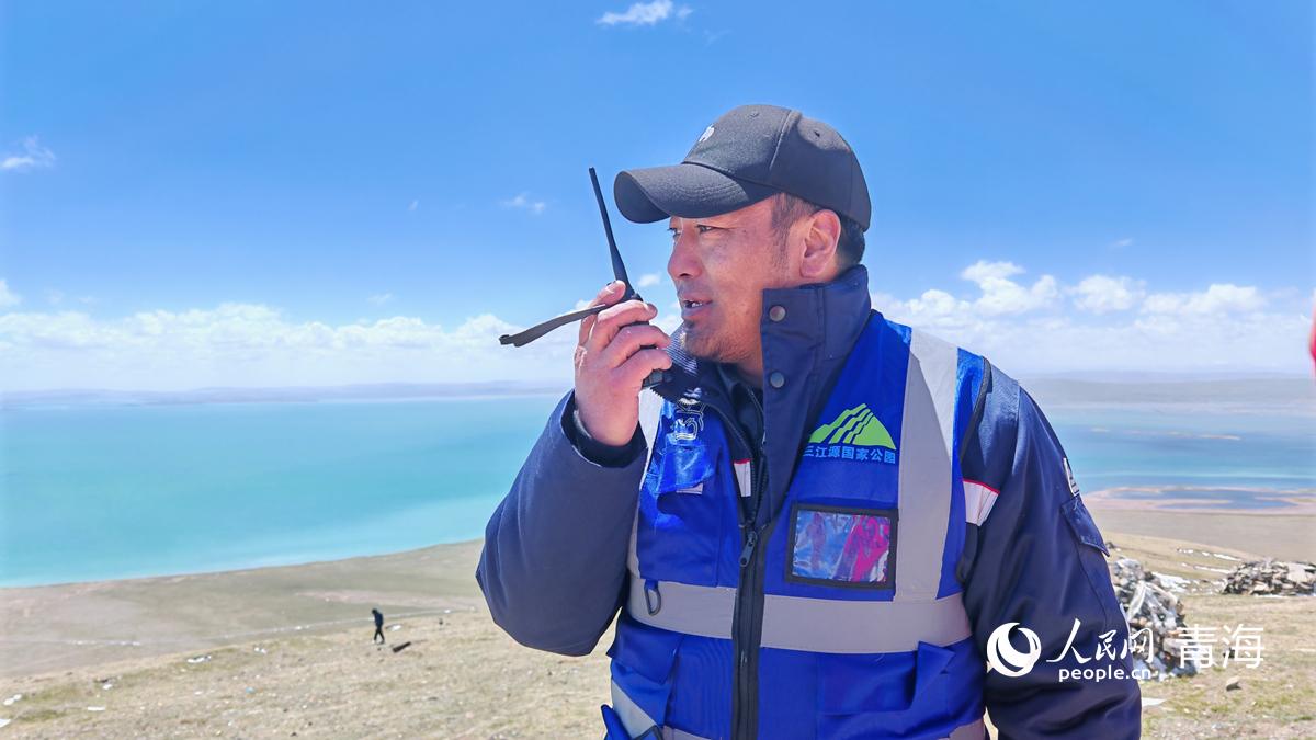 三江源國家公園黃河源園區的生態管護員格日杰布在海拔4610米的措哇尕則山頂峰巡護。人民網記者 楊啟紅攝
