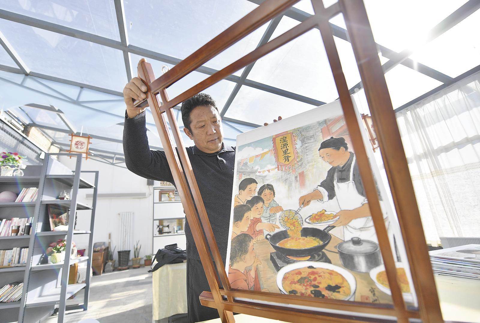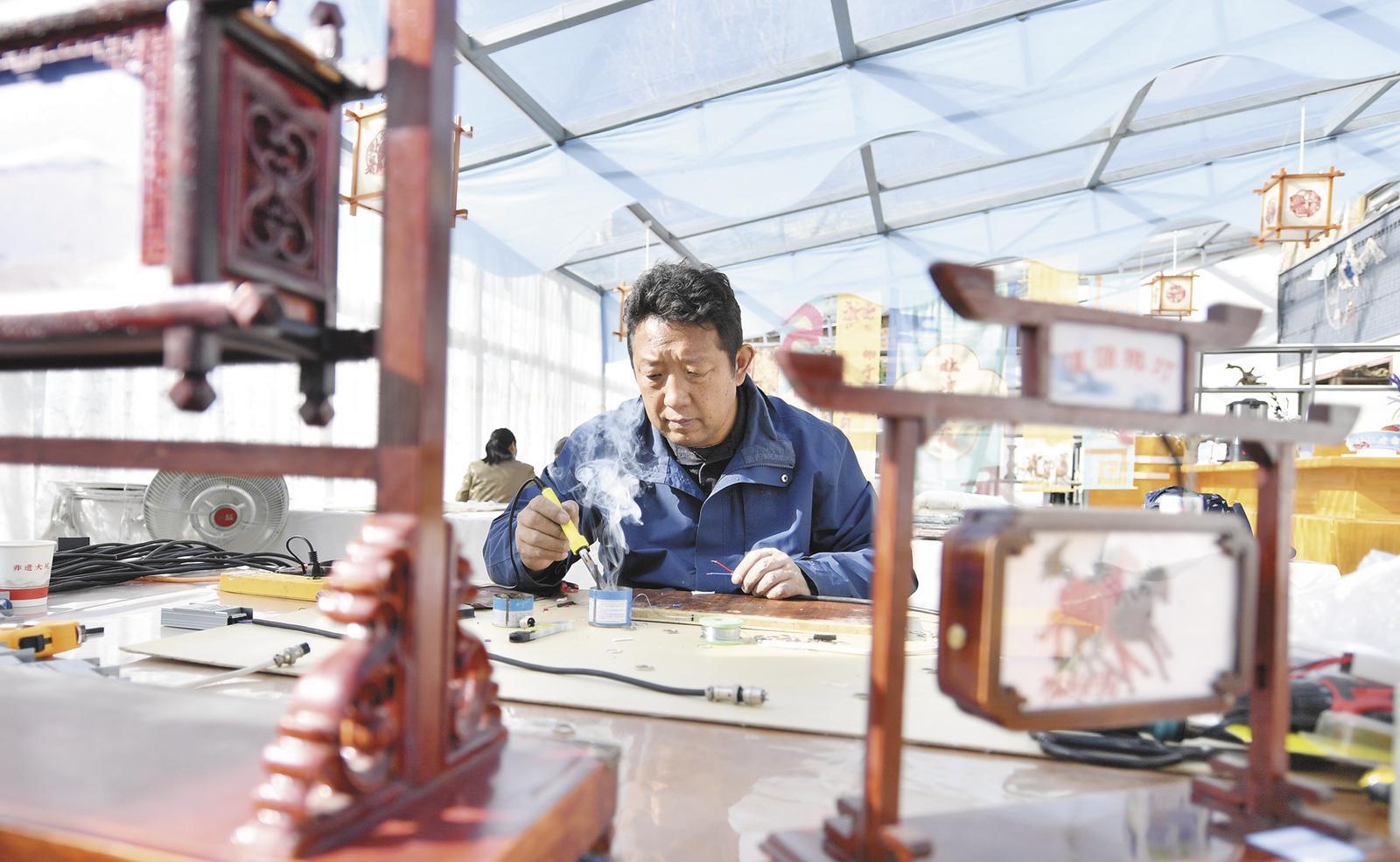 “這燈里藏著我們一輩子的堅守。”黨青云凝視著排燈感慨道。受家傳影響,他自幼學畫,涉獵古建、唐卡等多項技藝,1996年起專注排燈繪畫,已創(chuàng)作數(shù)百個排燈、上千幅畫面。如今的排燈在傳承中不斷創(chuàng)新,以明快畫面、講究上色為核心,融入多種非遺技藝,結合導光板技術優(yōu)化燈光效果?;叵朐缒杲涃M短缺、作品遭破壞的困境,黨青云滿心感慨:“如今抱團發(fā)展,用本土材料堅守古樸特質,才讓這國家級非物質文化遺產重煥生機?!?/p>