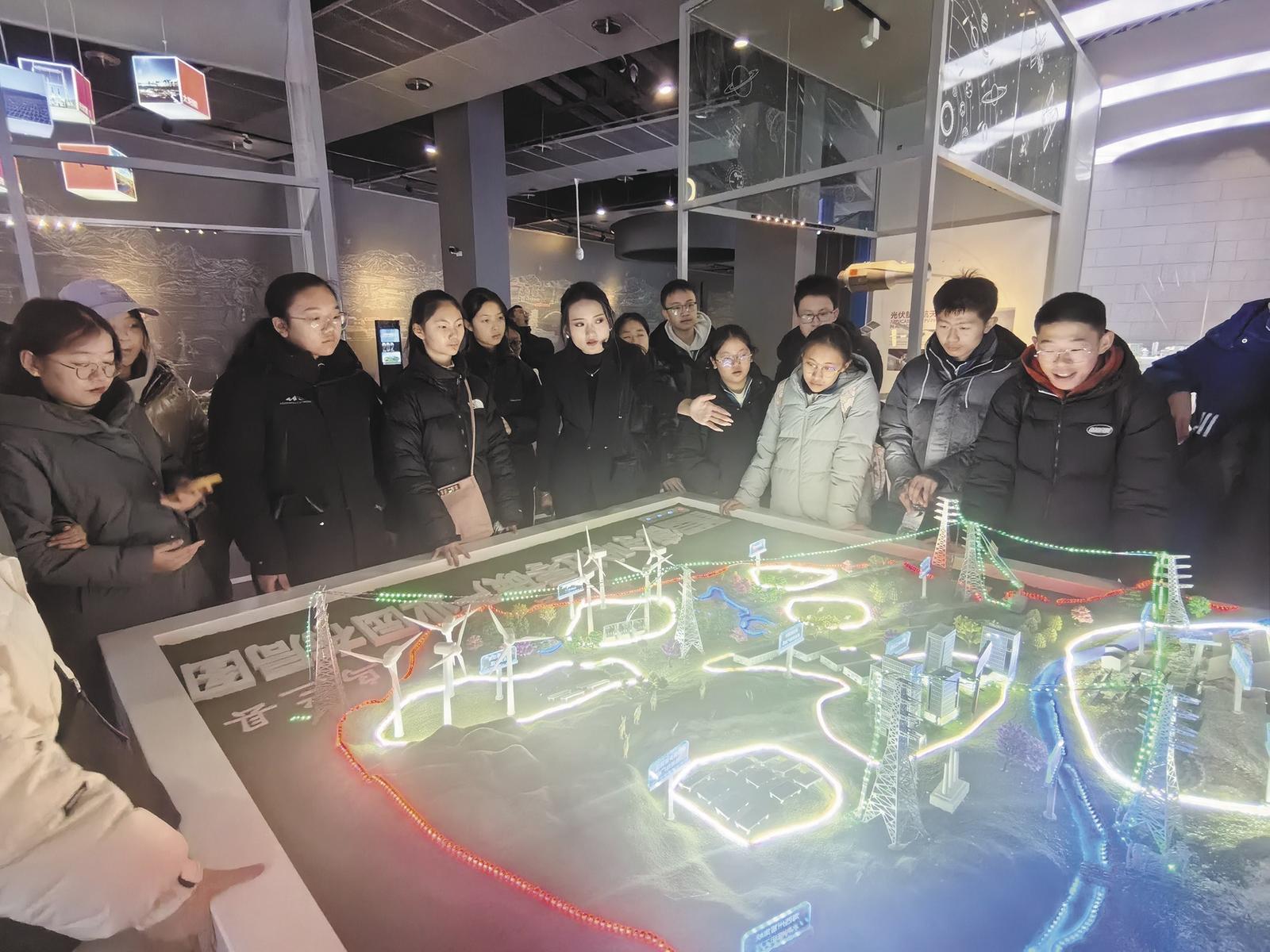 當天上午,同學們走進中國·青海清潔能源利用展示館。這里通過實物展示、互動體驗、多媒體演示等,全方位呈現太陽能、風能等清潔能源的開發與利用過程。講解員結合北斗衛星導航系統在能源監測中的實際案例,生動闡釋了青海生態保護與清潔能源共同發展之路。同學們認真聆聽、不時低頭記錄,隨后還踴躍參與各類互動體驗項目?!斑@個太陽能發電模型太有趣了,轉動手柄,燈光就亮了?!蔽鲗幨谢⑴_中學九年級二十一班的王梓嫣和九年級十五班的劉子爍親手操作能量轉化設備,在實踐中感受科技對可持續發展的重要支撐。