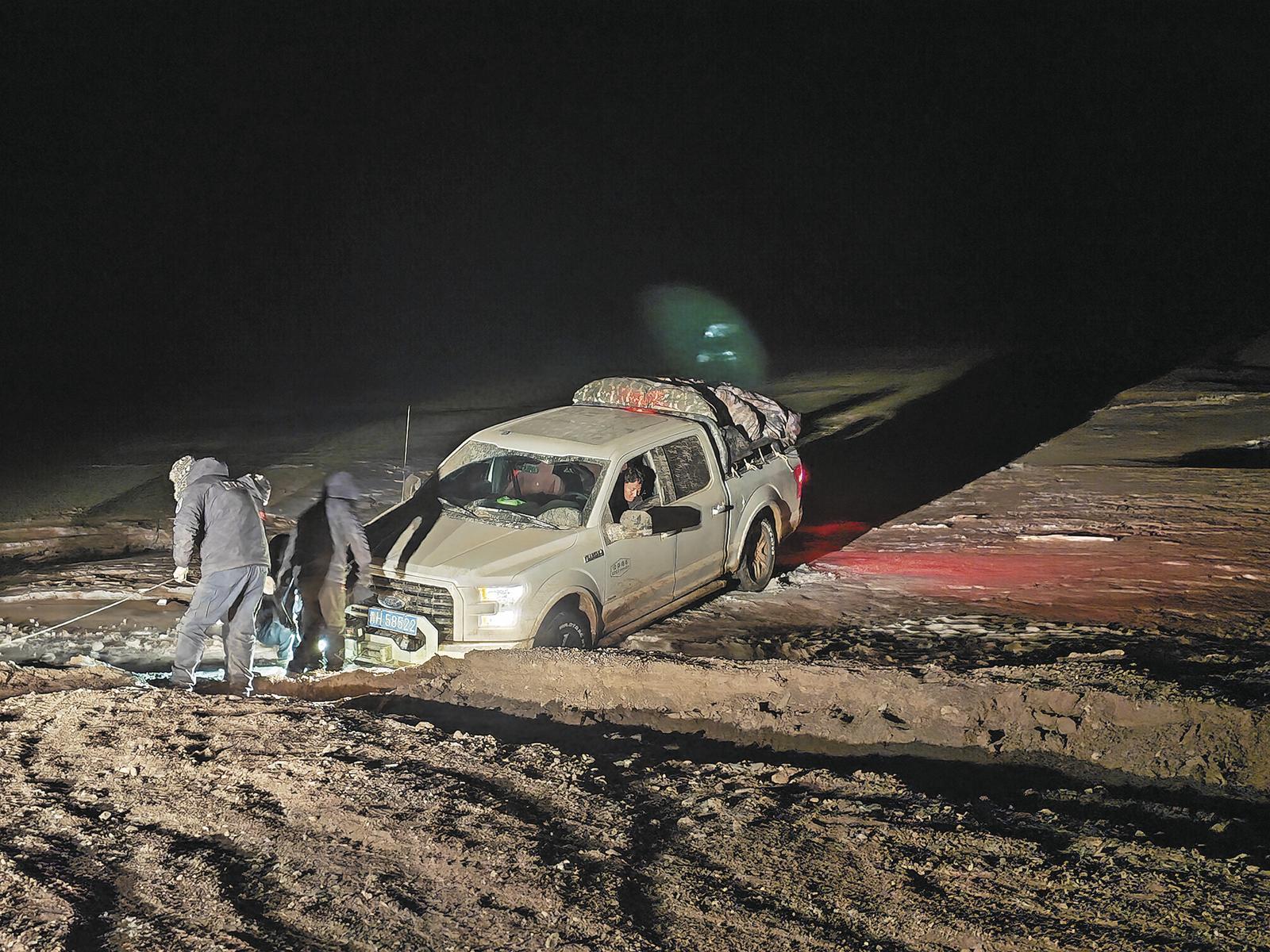 “此行主要為打擊N35非法穿越,我們沿著非法穿越者常走的路線,路上也遇到了很多困難。”隨隊記者口述,為了盡早趕到庫南保護站,8日20時一行人從太陽湖出發,車輛卻不斷陷入冰河,還遭遇了爆胎。9日早晨6時,大家才在車里休息了兩個小時,之后接著趕路。在斷斷續續的信號中,隨隊記者陸續發回現場照片和視頻。