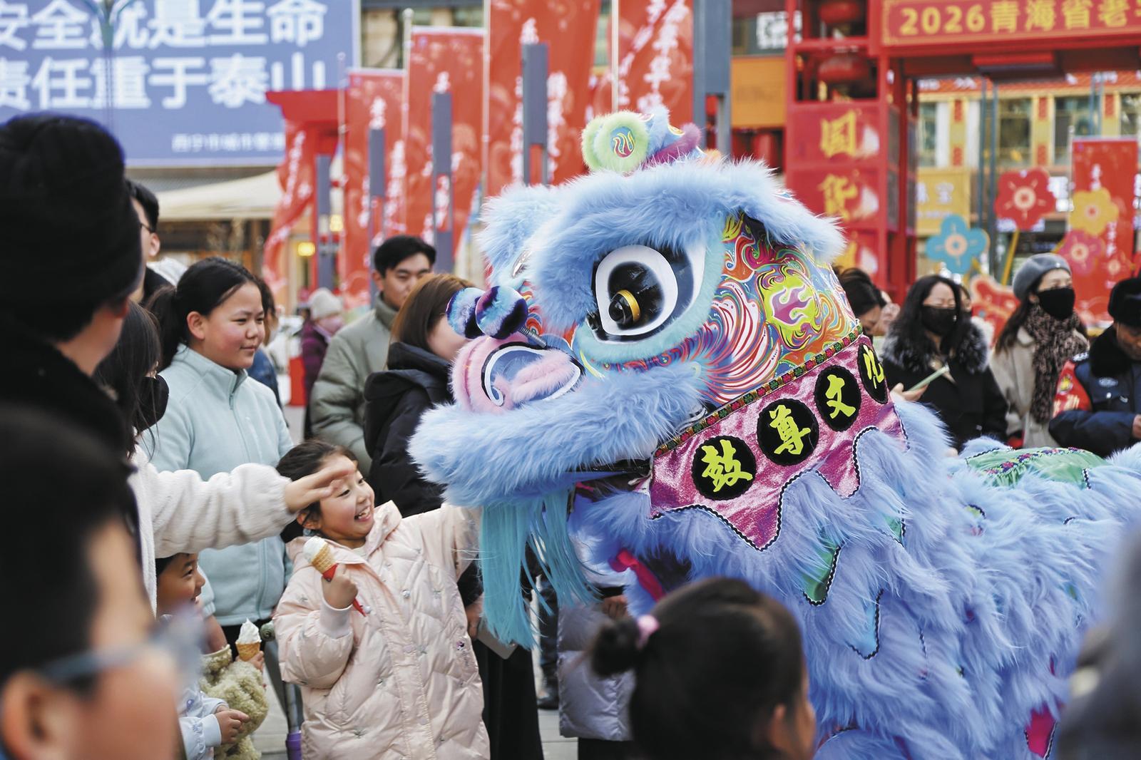 此外,一系列特色活動讓新春消費(fèi)的場景更鮮活、更有趣。“酒韻青海·拳王爭霸”現(xiàn)場,市民們圍在一起看猜拳行令,喝彩聲此起彼伏,現(xiàn)場還能品鑒青稞酒、了解傳統(tǒng)釀造技藝;“匠心臻品·新春競拍”以一元起拍的方式,拍賣老字號產(chǎn)品、特色手工藝品,吸引了不少收藏愛好者參與;舞龍舞獅、民族歌舞、雪豹寧萌IP互動等街區(qū)巡演,讓整個商業(yè)步行街變成了沉浸式的新春體驗(yàn)場,網(wǎng)紅打卡點(diǎn)前的一張張合影,定格了高原新春的熱鬧與美好。