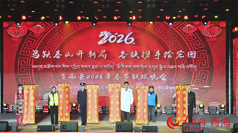 人民網西寧2月10日電 2月9日,由中共貴南縣委、貴南縣人民政府主辦的“馬躍春山開新局·各族攜手繪宏圖”——貴南縣2026年春節聯歡晚會在青海省海南藏族自治州貴南縣民族團結暨民俗展覽中心舉辦。此次春晚節目包含民歌、舞蹈、花兒等多種形式,展現出貴南各民族文化交融、民心相依的融融暖意與奮進活力。