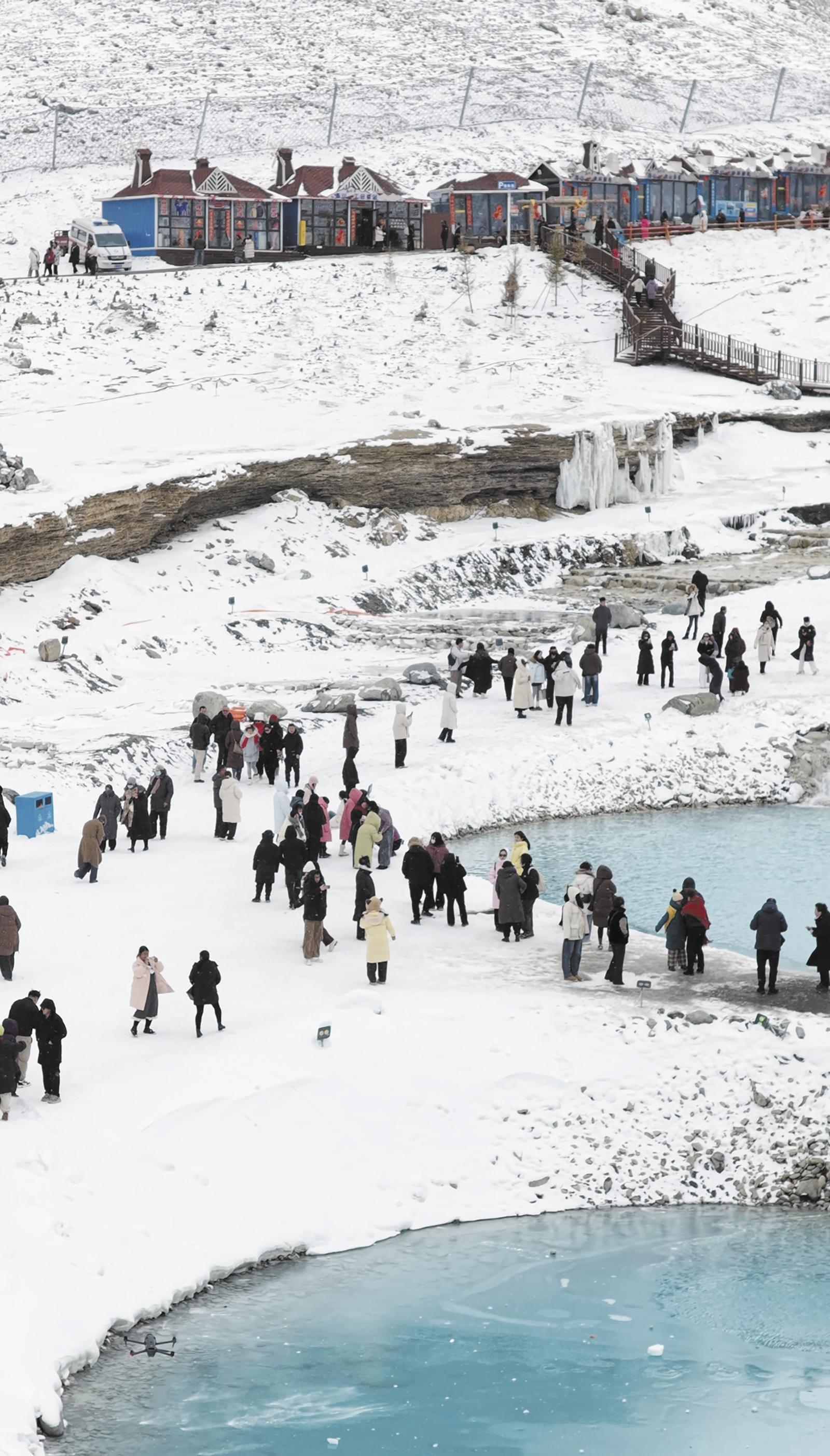 木棧道上,游客們?nèi)宄扇骸⒔Y(jié)伴而行,或扶著護(hù)欄遠(yuǎn)眺雪峰,或俯身觸摸晶瑩的積雪,目光里滿是初見雪山的驚喜與贊嘆。來(lái)自西安的張穎舉起手機(jī),興奮地對(duì)著雪峰取景,“早就把崗什卡定為我的人生第一座雪山,今天終于圓夢(mèng)了!”