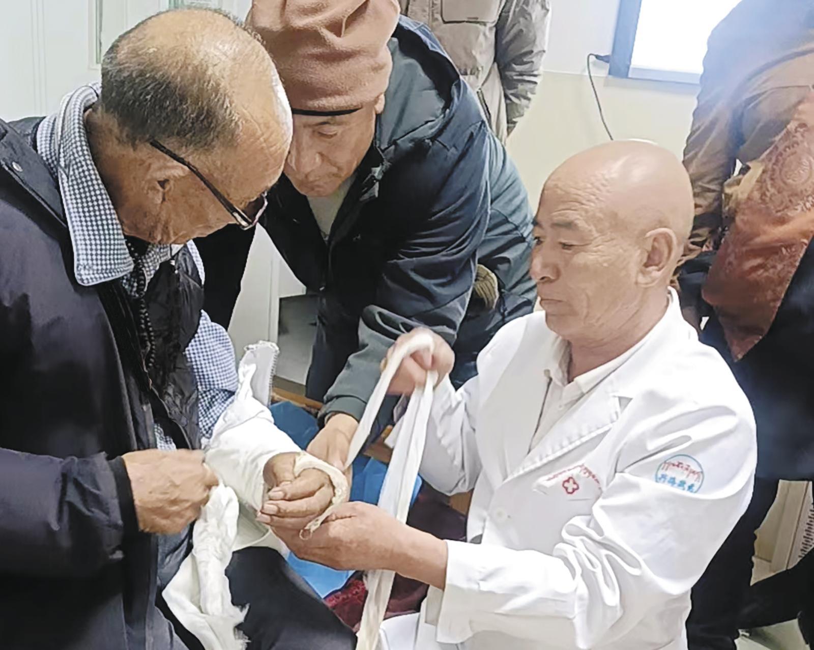 扎西東主給患者進行包扎。興海縣藏醫(yī)院供圖