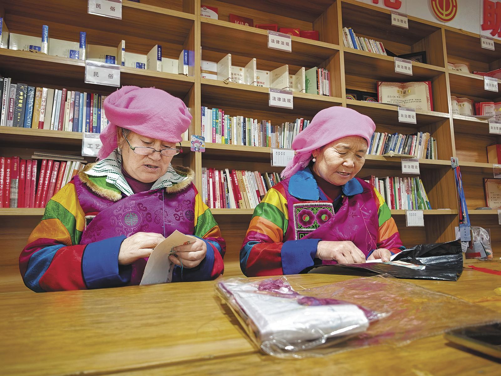 繡娘李旦見索(左)和張卓麻什姐一起用土族盤繡繡出美好生活。