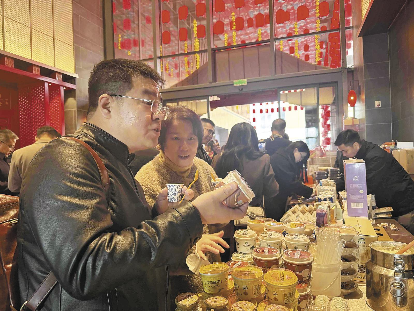 席間,來自“中國(guó)藏族山歌之鄉(xiāng)”玉樹藏族自治州雜多縣的演員身著盛裝、手捧哈達(dá)登場(chǎng)。高亢婉轉(zhuǎn)的歌聲穿透廳堂,舒展靈動(dòng)的依舞、熱情奔放的鍋莊舞輪番上演,現(xiàn)場(chǎng)還邀請(qǐng)消費(fèi)者互動(dòng)共舞,使賓客在品味高原風(fēng)味的同時(shí),深切感受青海濃郁的民族文化風(fēng)情。江蘇游客李先生一邊跟著節(jié)拍舞動(dòng),一邊贊嘆:“邊品嘗青海牦牛肉,邊欣賞歡快的舞蹈,感覺特別放松,這個(gè)年過得分外有味道!”