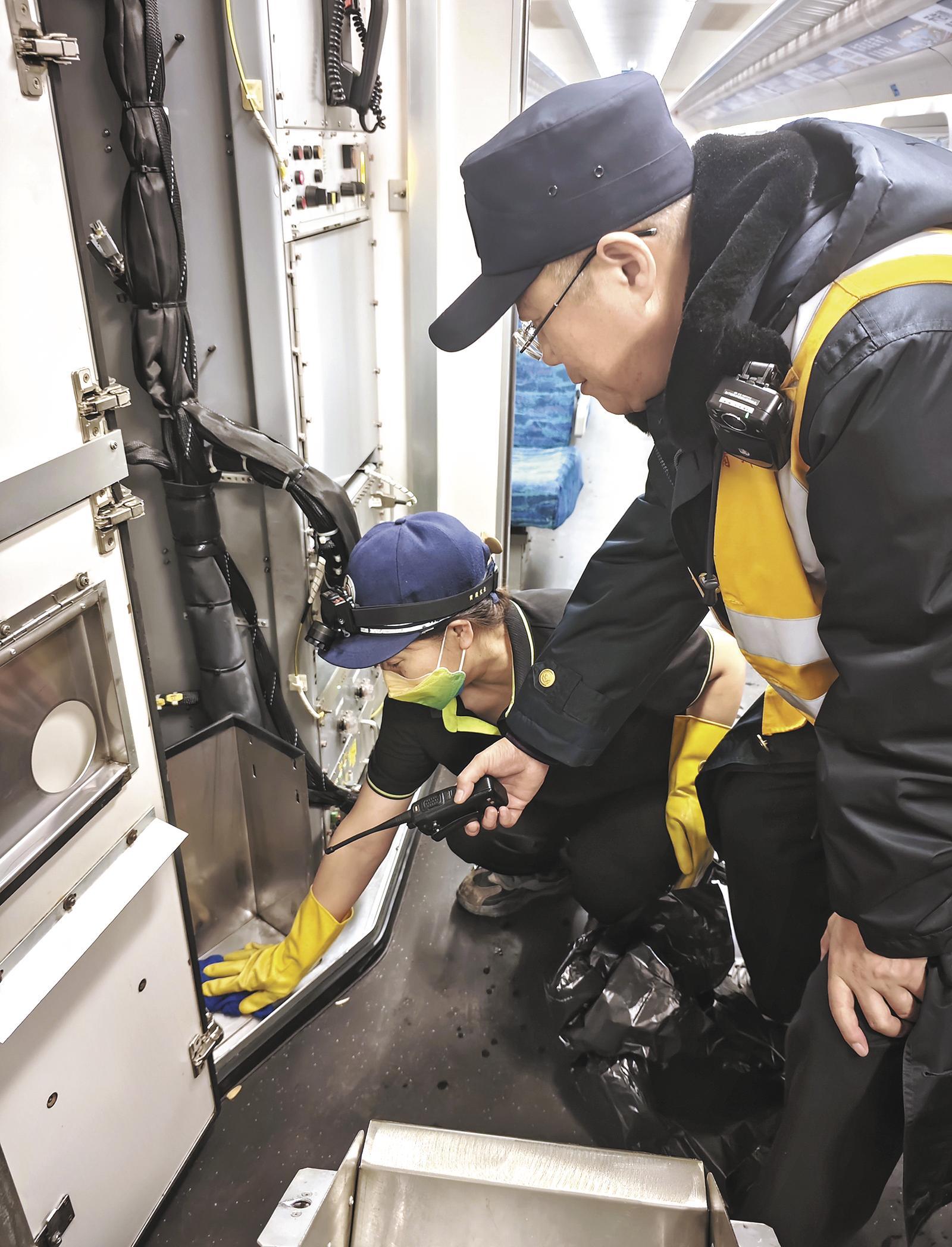 王英正在檢查動車上的衛生細節。記者 王湘琳 攝