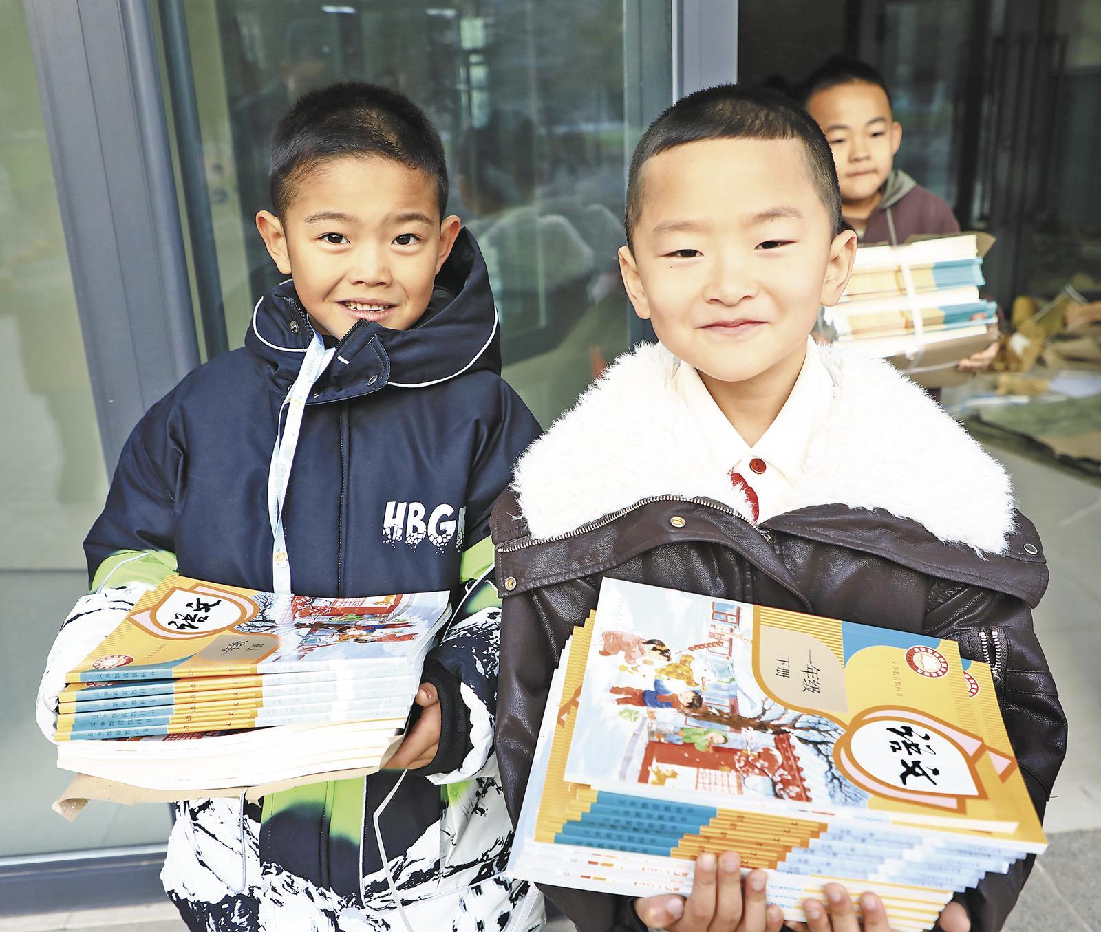 圖為向教室搬運新課本的東垣小學學生。記者 魏雅琪 通訊員 石延壽 攝