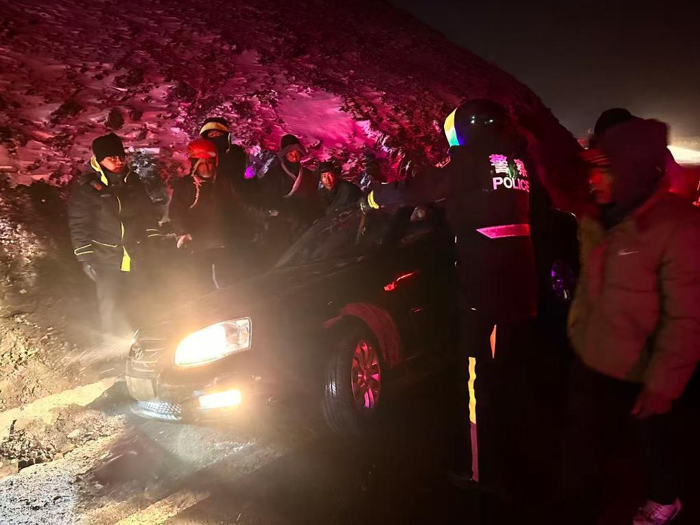 折多山警務站民輔警幫助側翻的私家車脫困。(甘孜公安供圖)