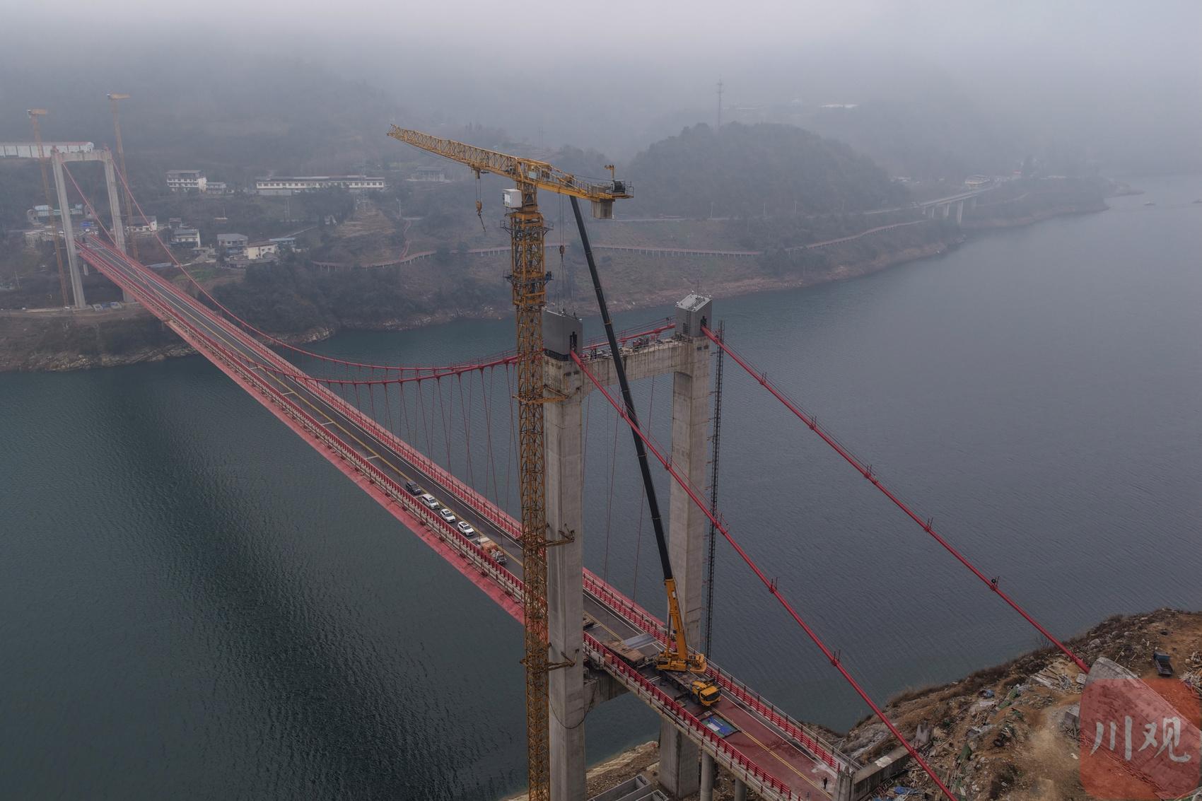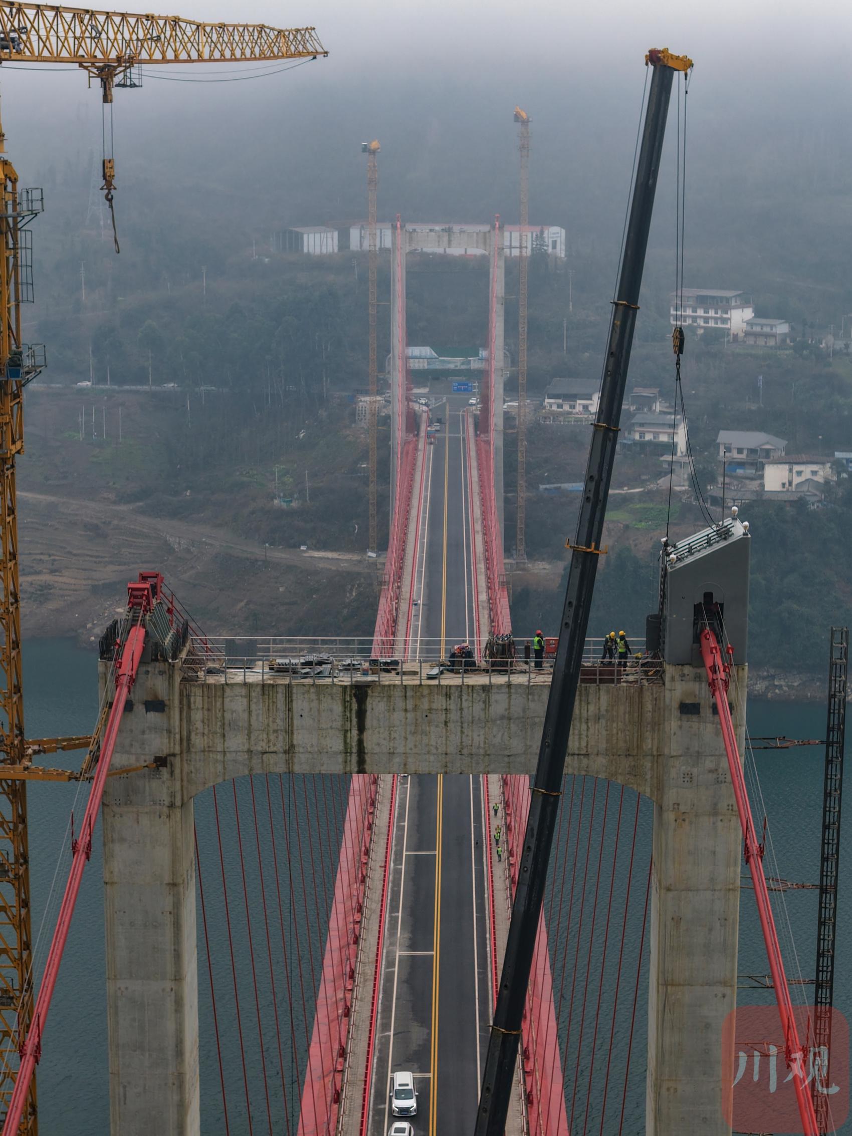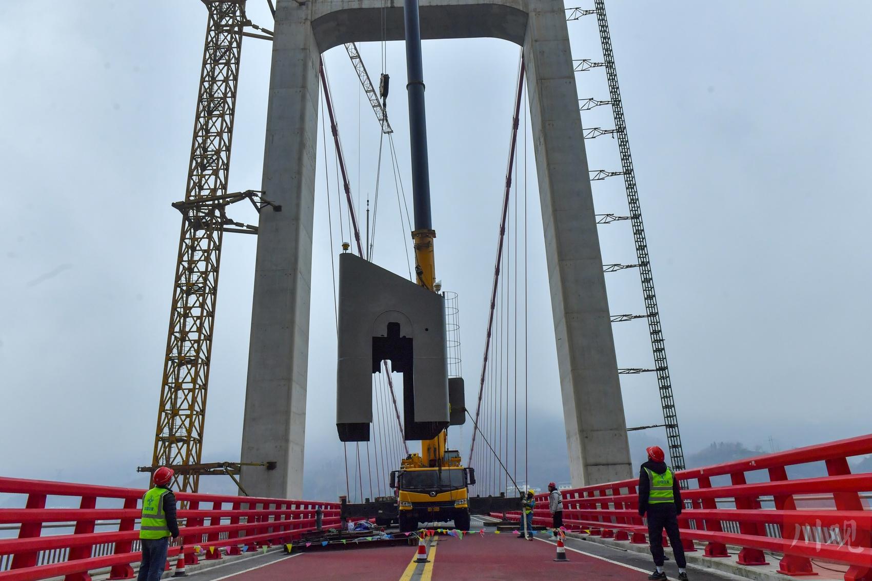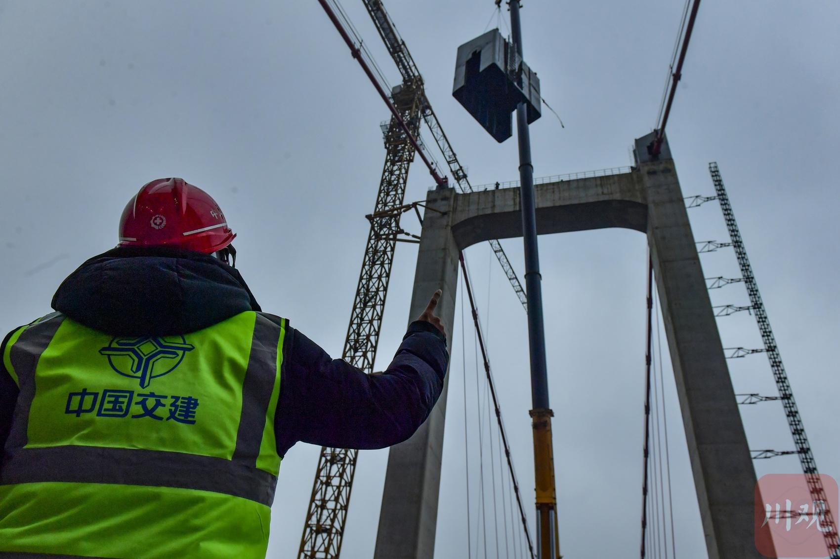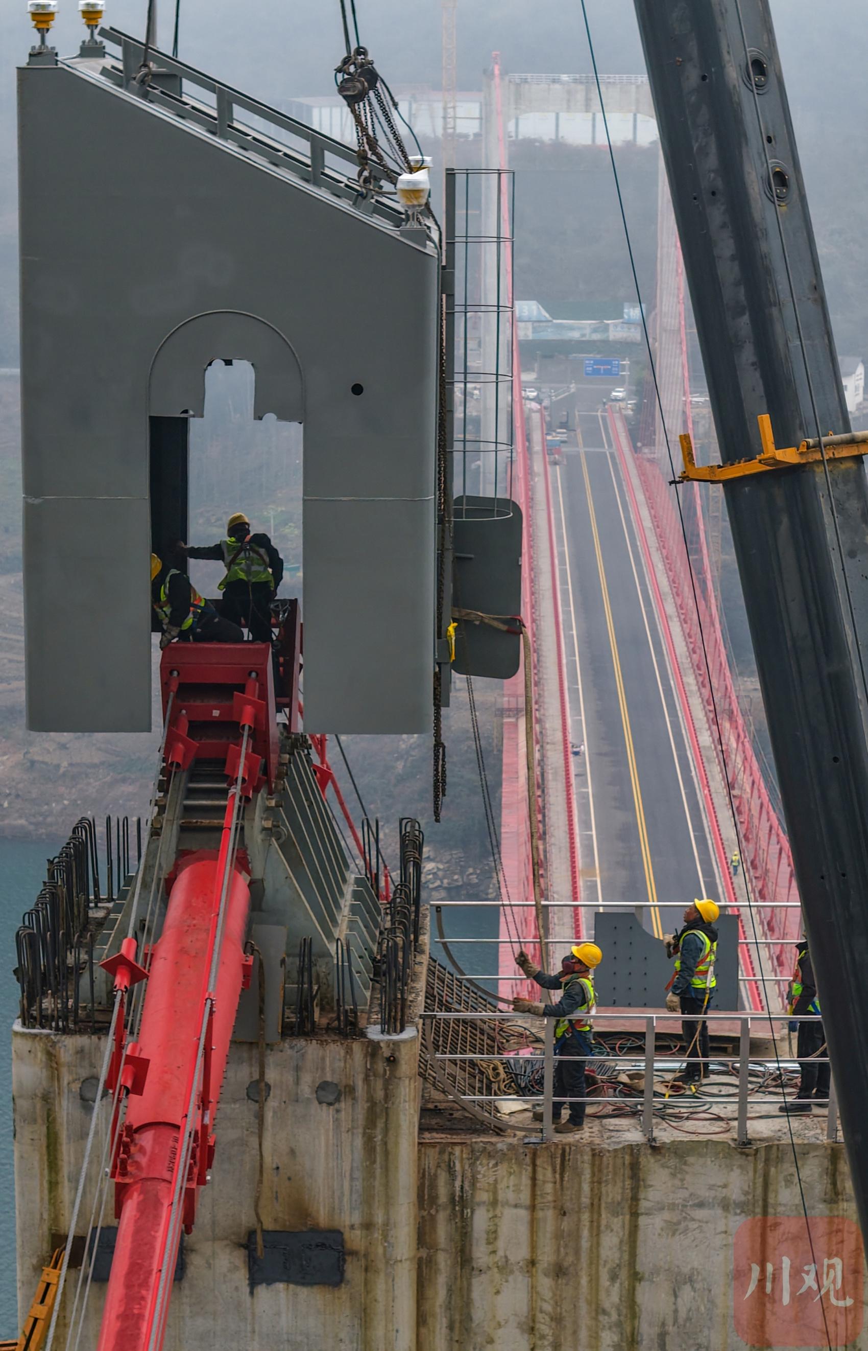 2026年1月19日,國道317線友誼隧道至汶川映秀段改建工程紫坪鋪特大橋施工現(xiàn)場(chǎng),工人正在大橋主塔塔冠吊裝。