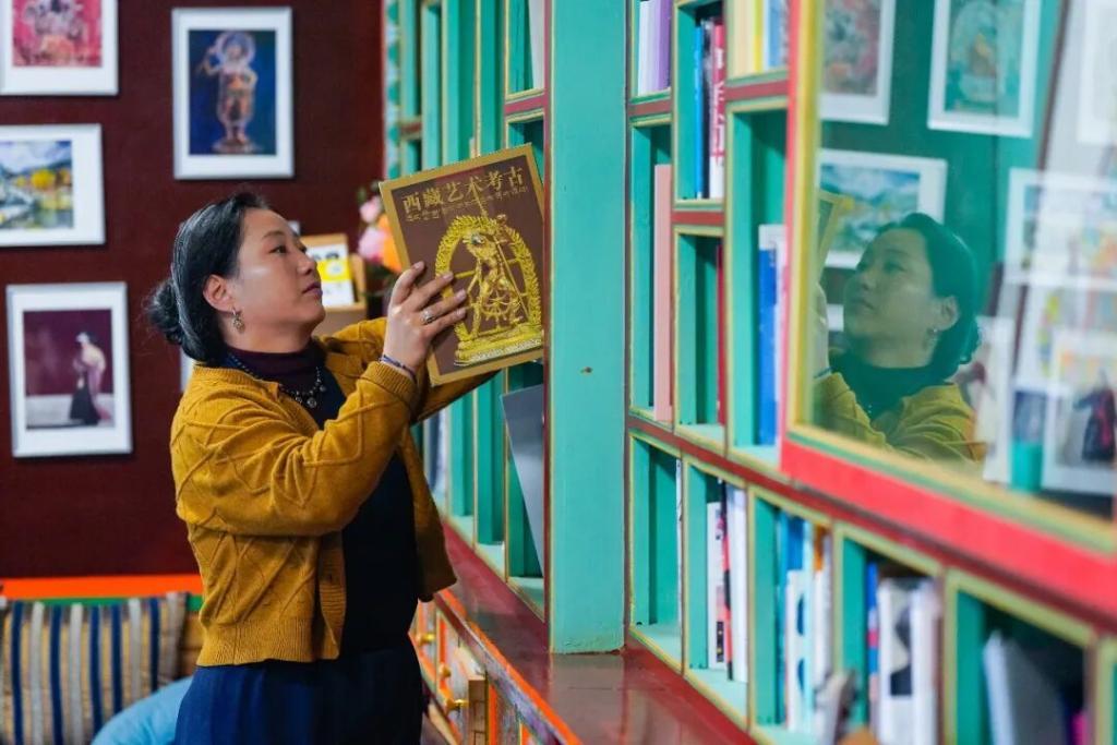 達瓦卓瑪在“欽樂民宿”公共空間整理提供給住客閱讀的書籍。