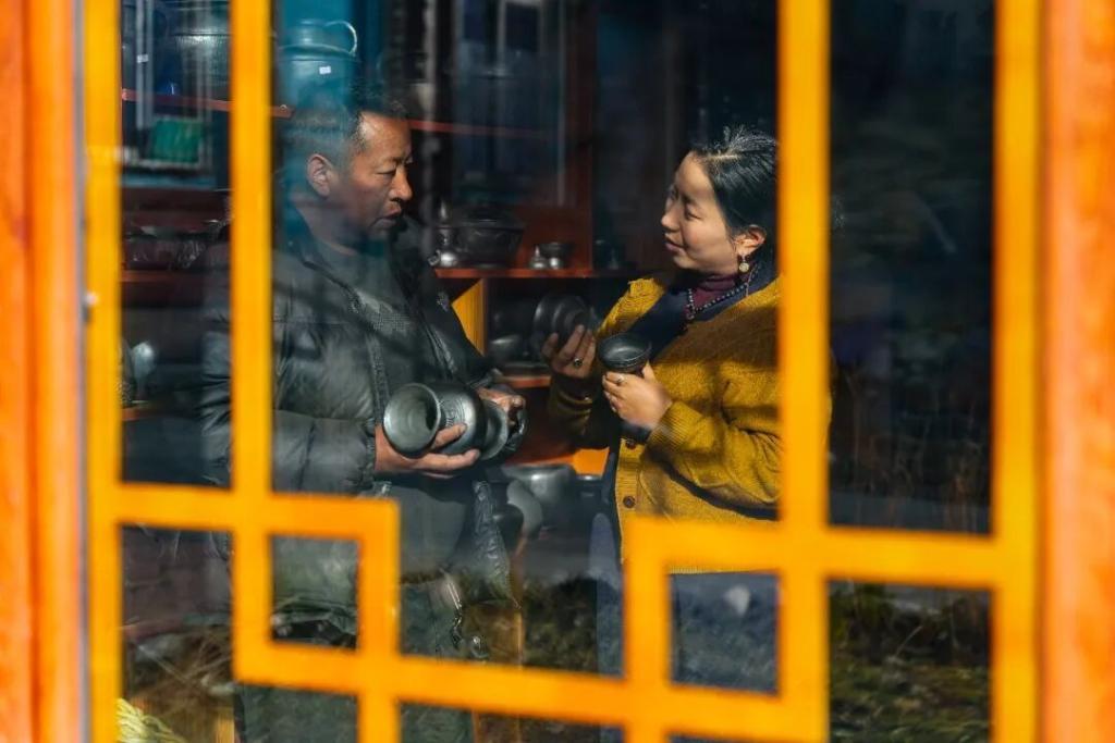 在德格縣麥宿鎮的扎堪倉黑陶工坊,達瓦卓瑪(右)向工坊主理人降擁格乃了解工坊近期的經營情況以及新品研制進展。