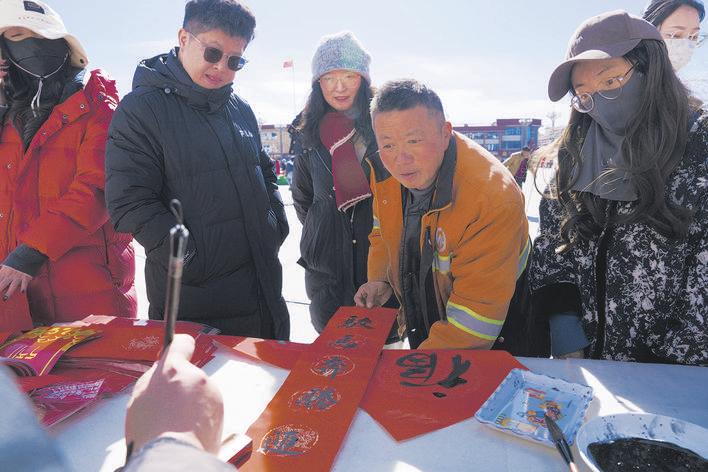 阿壩州文聯精心組織漢字、藏文書法家來到活動現場揮毫潑墨,為現場群眾義務書寫春聯和福字。書法家們以墨傳情,既有端莊大氣的漢字春聯,也有雋秀流暢的藏文祝福,墨香與年味相融,喜慶氛圍格外濃厚。與此同時,攝影師免費為群眾拍攝以北京天安門廣場為背景的紀念照片。羅州甲措大叔拿到照片高興地說:“我把這張照片發到家族群里,他們都問我是不是去北京了!”。