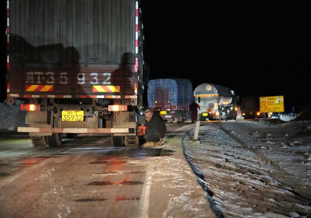 1月30日晚的這場大雪,依然來得突然。不少車輛都靠邊停車安裝防滑鏈,一對開罐車的夫妻蹲在車輪旁反復測試防滑鏈是否拉緊。經常翻越折多山的這對夫妻說:“下午在康定還是晴天,不過走折多山,防滑鏈是必備品。”