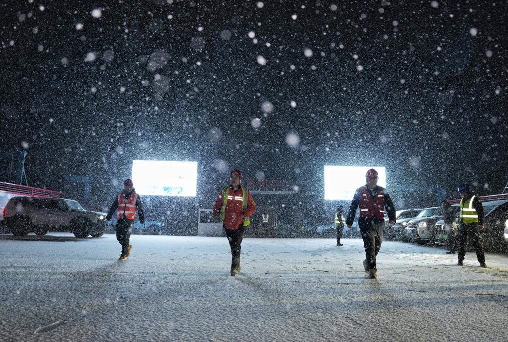 1月30日晚,折多山大雪紛飛,工人們在折多山隧道施工點位前。新華社記者 劉坤 攝