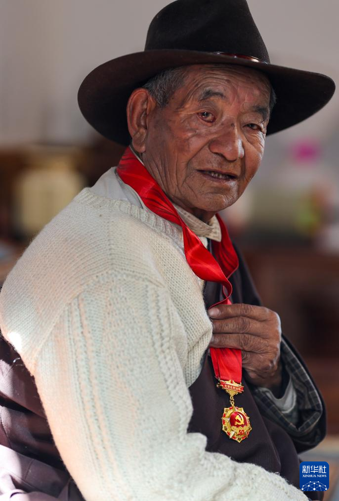 80歲的扎巴旺旦老人展示自己的“光榮在黨50年”紀念章(3月11日攝)。新華社記者 姜帆 攝