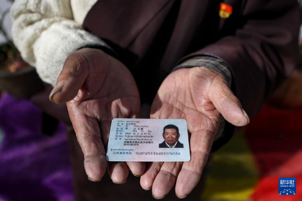 扎巴旺旦在展示自己的身份證(3月11日攝)。新華社記者 姜帆 攝