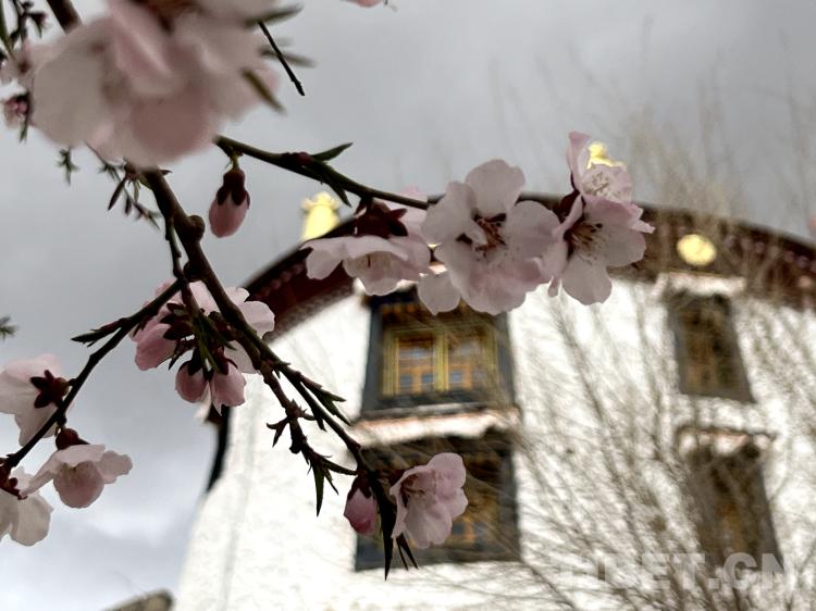 圖為帕邦喀古建筑與桃樹同框的畫面