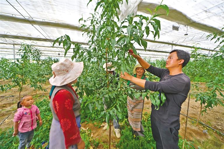 尼木縣“點(diǎn)對(duì)點(diǎn)”干部王榮華(右一)向群眾傳授平谷大桃種植技術(shù)。