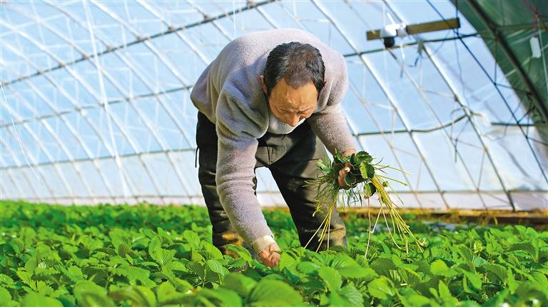 圖為吞彌現(xiàn)代農(nóng)業(yè)產(chǎn)業(yè)園種植人員在草莓種植大棚內(nèi)除雜草。本報(bào)記者 鹿麗娟 攝